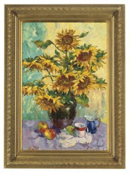 Sunflowers in a vase with fruits, a jug and a cup on a table