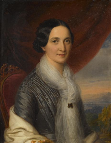 Brustbildnis einer Dame vor Landschaftsausschnitt.