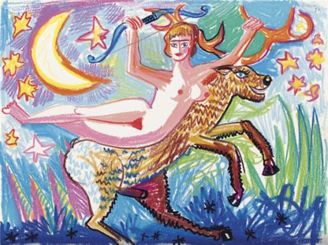 | Wax crayon, oil pastel and felt-tip marker on paper | |