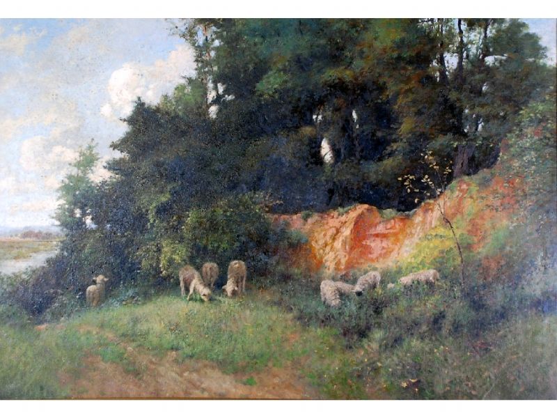 | Sheep grazing beside a track with woodland beyond, water meadows in the distance | |