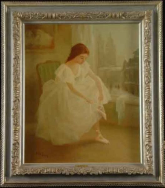 | Ballerina beim Schuhebinden, im Fensterausschnitt die Silhouette von Prag | |