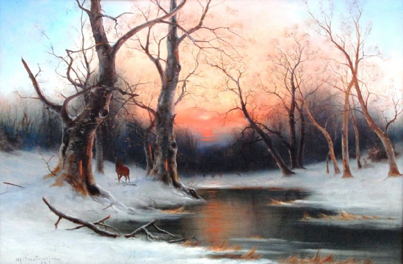 Winter scene with deer in a wooded landscape