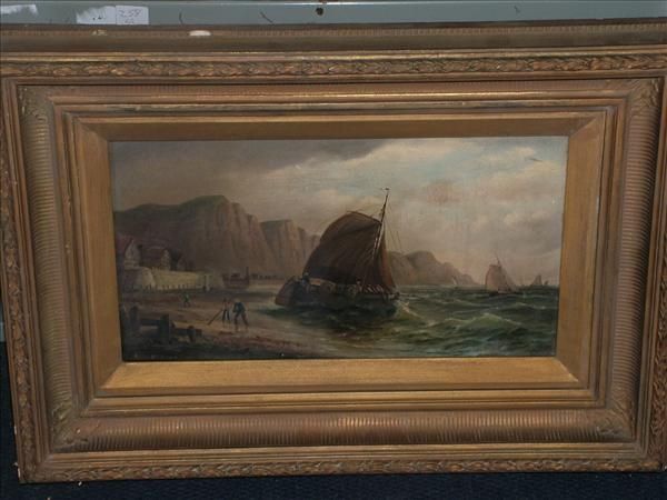 A rocky coastal scene with boats and figures