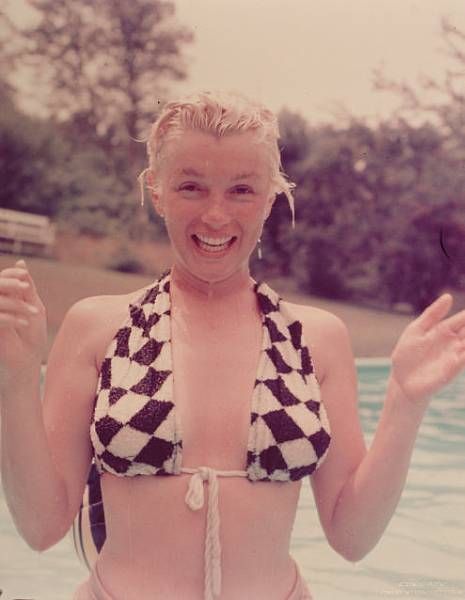 | Marilyn Monroe, wearing a checquered towelling bikini top, wet from the pool | |