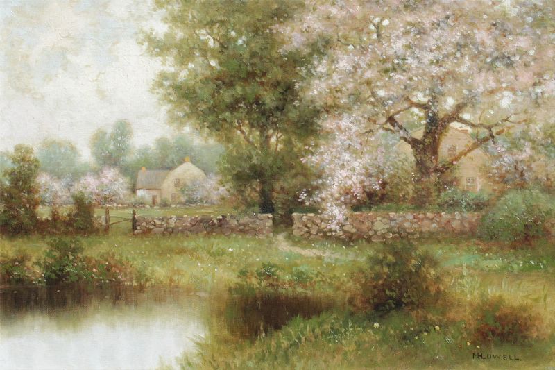 Farm Houses by a Stream with Blossoms in the Apple Trees