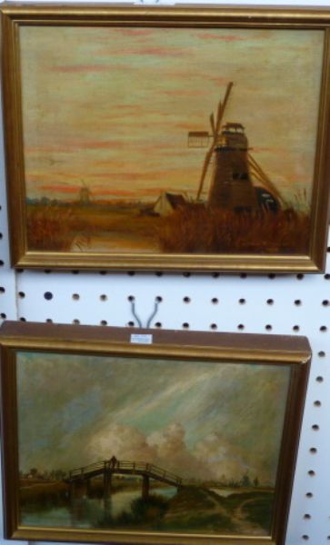 Bridge over a dyke, Mindmills at sunset, a pair
