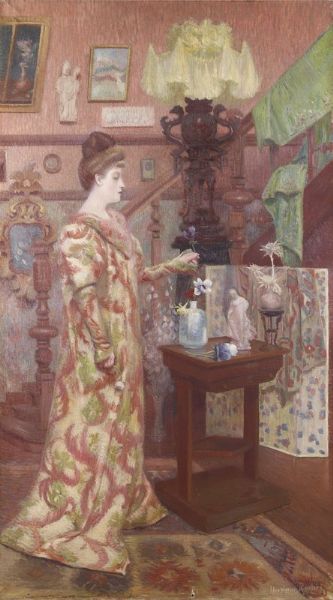 FEMME EN PEIGNOIR ARRANGEANT DES FLEURS, DANS UNE CAGE D'ESCALIER