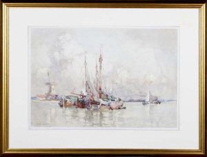Dutch sailing barges moored by a windmill