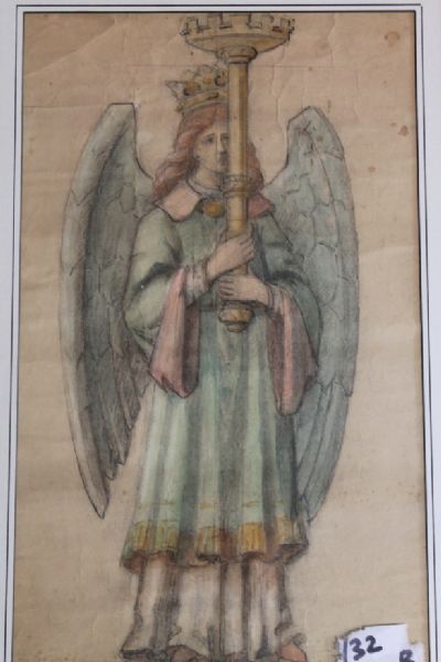 The figure of an angel holding a castellated candle holder