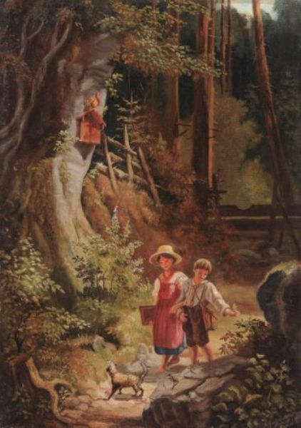Zwei Kinder mit Hund beim Spaziergang im Wald. 2nd half 19th cent.