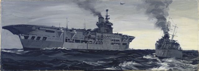 | The British aircraft carrier, H.M.S. Arc Royal and a British naval frigate in pursuit | |