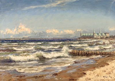 Öresund-Einfahrt mit Schloss Kronborg und die schwedische Küste bei Helsingborg