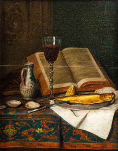 Stillleben mit Krug, Buch, Weinglas und Fisch