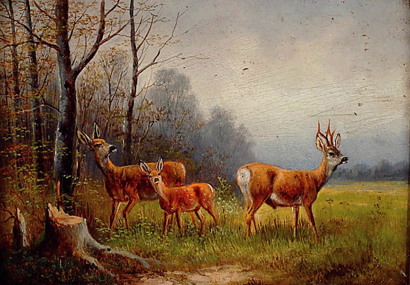 | Rehe in Waldlichtung, feine lasierende Malerei, schöne Tiefenwirkung | |