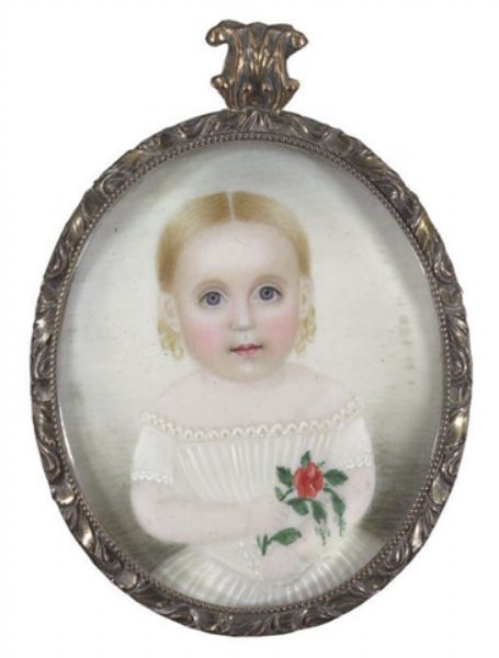 | A Miniature Portrait of a Girl with Blond Curls in a White Dress Holding a Rose | |