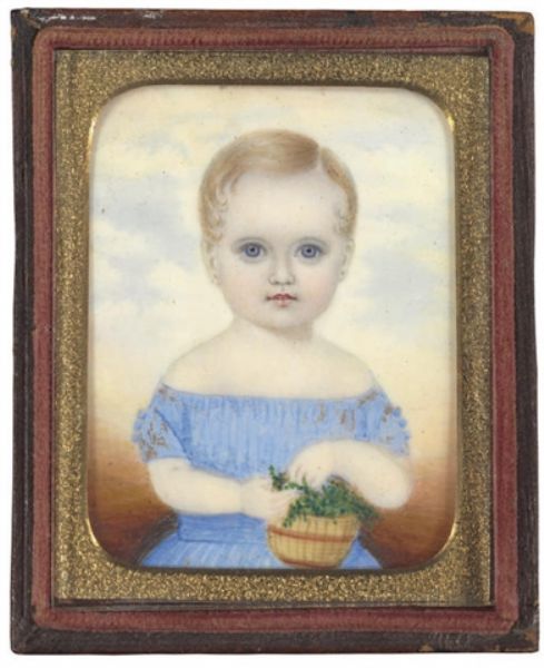 | A Miniature Portrait of a Young Girl in a Blue Dress Holding a Basket | |
