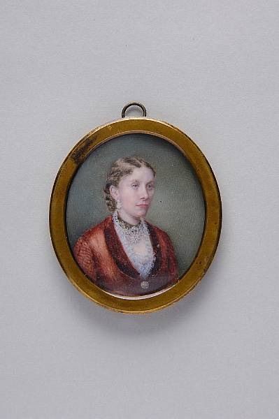 A miniature portrait of Mrs Horley, wearing a burgundy dress, diamond necklace and earrings