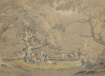 | Mucisiens et bergers avec leur troupeau sous les arbres | |