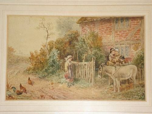 | A country scene with sheep on a lane and figures by a gate, and another of children and a donkey by a cottage | |