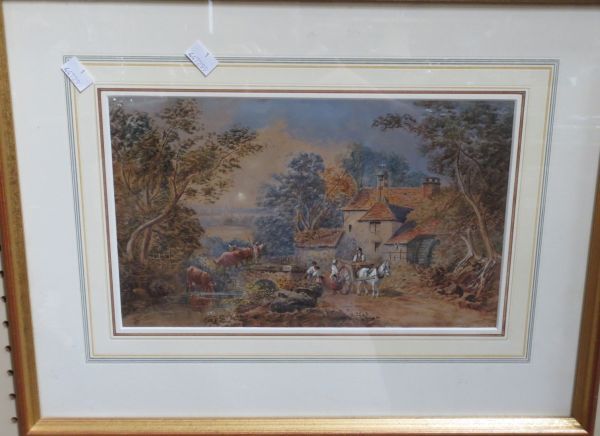 Figures and livestock before a stream and watermill