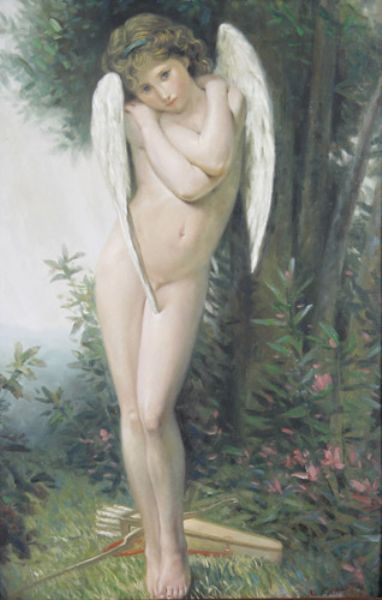 Im Wald stehender Amorknabe mit verschränkten Armen, hinter ihm liegen Pfeil und Bogen