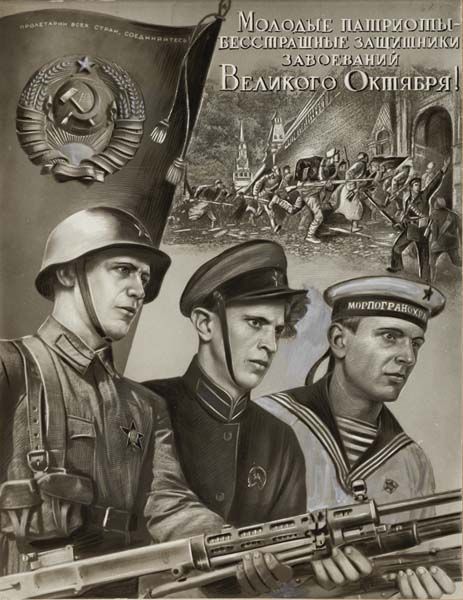 | Poster of the painter A. Gubin published by Rostov, department of Souz Photo, at the 20th anniversary of Lenin and Stalin Komoso | |