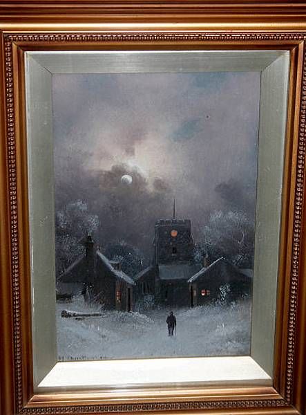 moonlit winter scene with a figure standing before a church, on board under glass