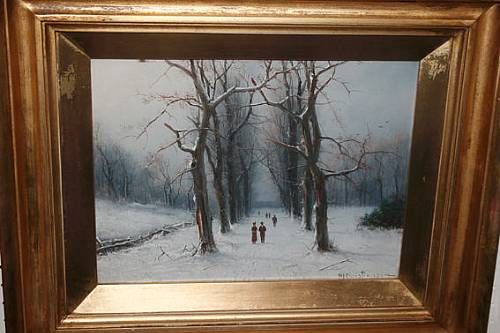 Winter scene with figures on a tree lined avenue, on board under glass