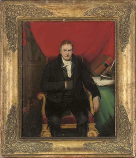 | Portrait of a man, three-quarter length, in a black coat and white neck tie, seated at his bureau | |