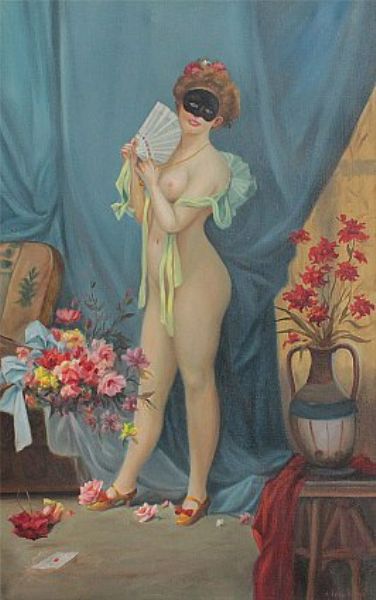 Nude in Mask in front of a Blue Curtain Holding a Fan
