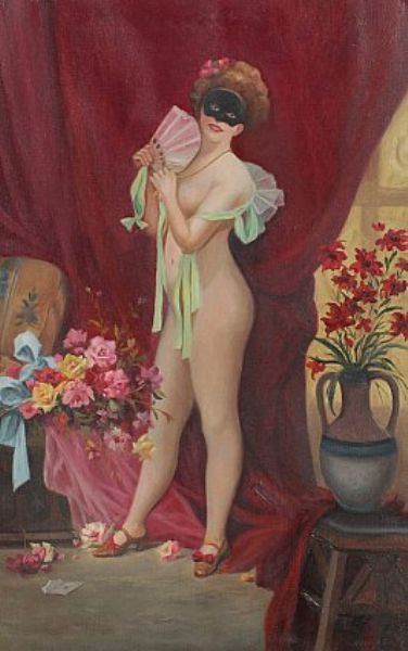Nude in Mask in front of a Red Curtain Holding a Fan