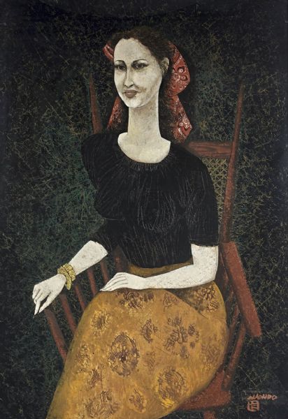 FEMME ASSISE COIFFÉE D’UN FOULARD ROUGE.