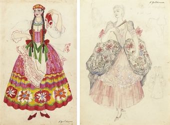 | A costume design for a girl in traditional costume; and A ballgown design | |