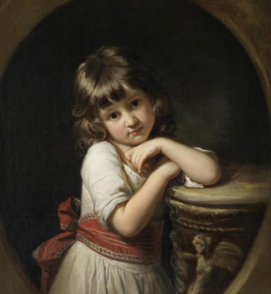 | Portrait of Lucy Hanstead, three-quarter-length, in a white dress with a red sash, leaning on a pillar, within a painted oval | |