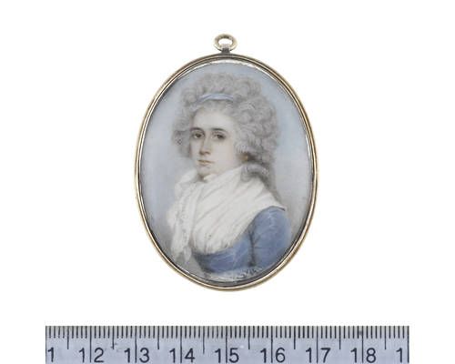| Mary Ann Chantrey, wearing blue dress with white fichu and lace trimmed scarf, her powdered hair dressed with a blue ribbon | |
