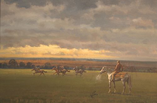 | Landscape with Owner watching Racehorses training with Jockeys-up | |