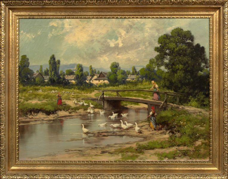View of Women Feeding Geese by a Woodland Stream