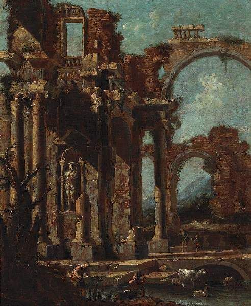 An architectural capriccio with figures in ruins