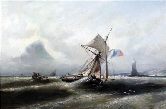 Fishing boat in a squall, a lighthouse beyond