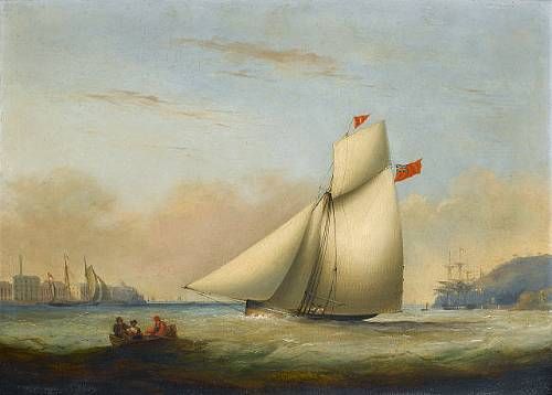 | A racing cutter under full sail running up the Hamoaze past the buildings of the Royal William Victualling Yard at Stonehouse, P | |