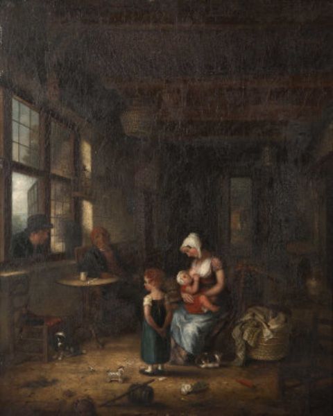 Good Morning - a cottage scene with figures in an interior greeted by a man at the window