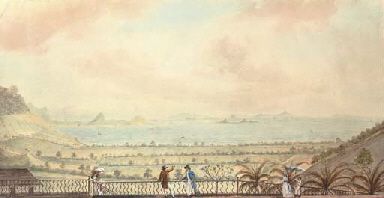 | A panoramic view of a plantation in the West Indies with planters and slaves on a terrace in the foreground | |