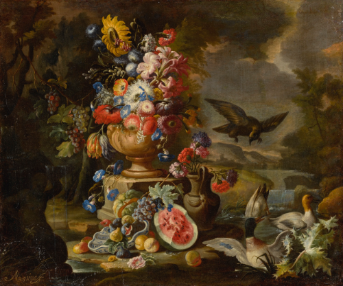 | A STILL LIFE WITH A VASE OF FLOWER, BIRDS, A WATERMELON, PEACHES, GAPES, AND OTHER FRUIT IN AN OUTDOOR SETTING | |