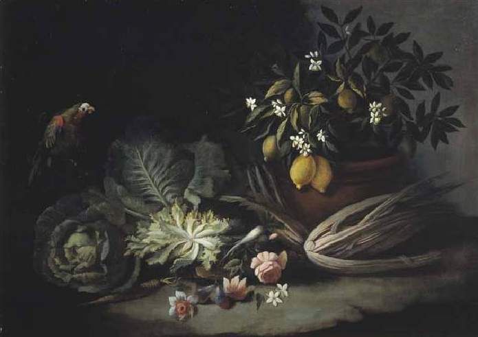 | NATURA MORTA CON PIANTA DI LIMONE, ORTAGGI E PAPPAGALLO | |