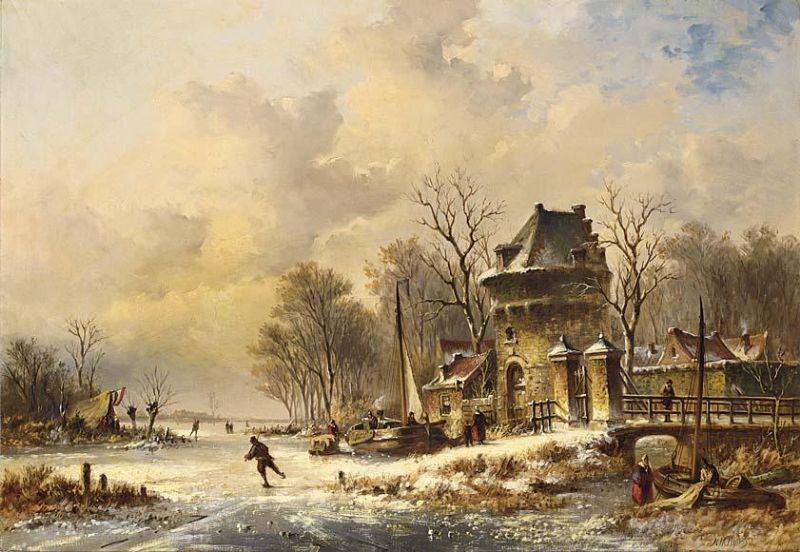 A WINTER LANDSCAPE WITH SKATERS NEAR A VILLAGE