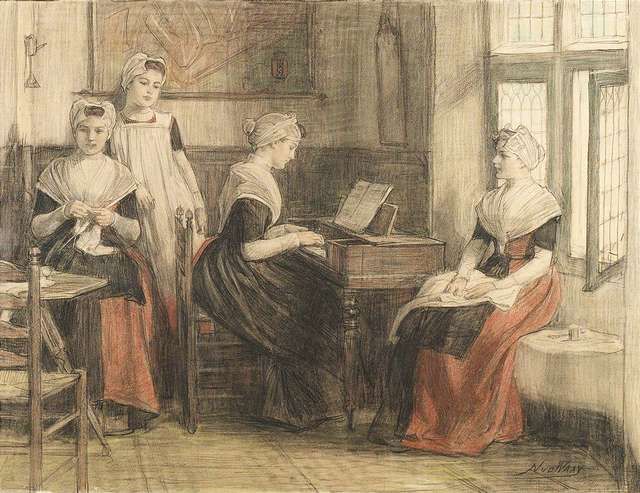 | Netherlands interior with four young ladies, one of them playing on a piano | |