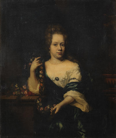 Portrait of a lady three-quarter-length, in white dress and blue silk shawl
