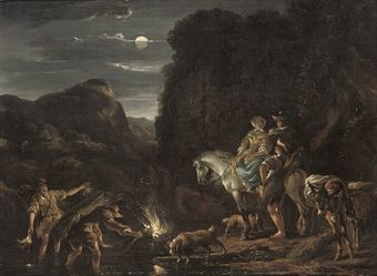 | A moonlit river landscape with travellers on horseback conversing with crayfishers | |