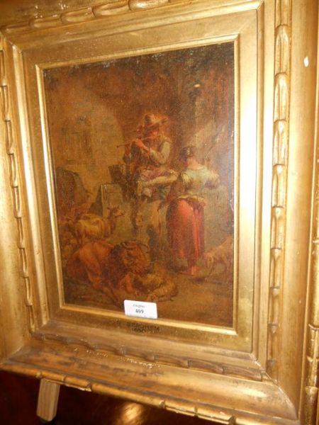 | A shepherd piping to a shepherdess, in an interior, with cows and sheep | |
