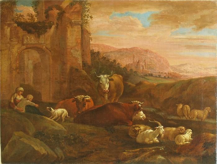 | Italienische Landschaft mit rastender Hirtenfamilie und ihrer Herde | |